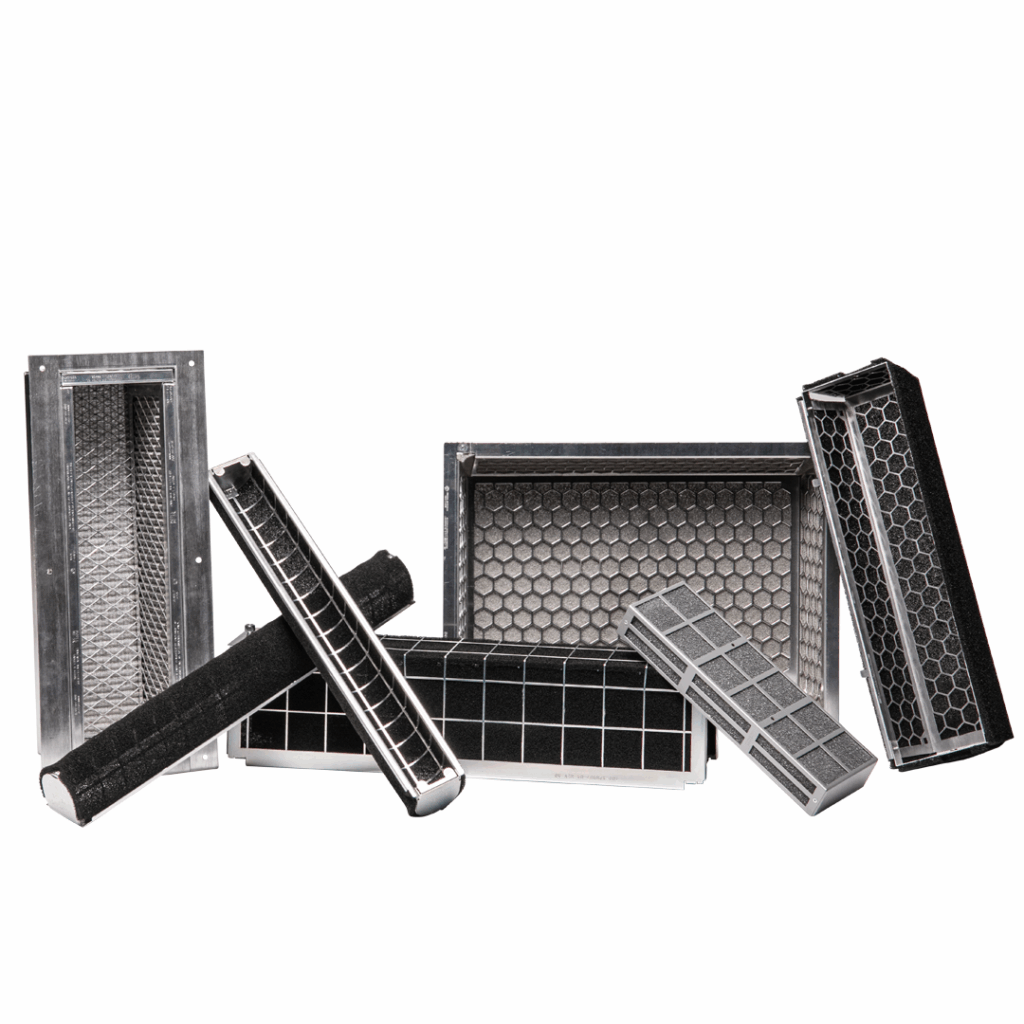 UAF 3-Dimensional (Basket) air filters are the ideal solution to provide additional air intake area to provide the increased air flow and reduced resistance needed for the cooling of compact telecommunications platforms. UAF’s 3-D Basket Filters help designers of compact, 1U to 4U, telecom and networking enclosures to keep the system in thermal equilibrium (or thermally positive) while maintaining the stringent requirements of the Telcordia NEBS GR-63 standards. UAF 3-D Basket filters can also be used Medical and Military electronics equipment. Adding depth to an electronics enclosure air filter can provide up to 4 times more air flow than typical flat panel air filters while reducing impedance by up to 50%. This means additional air flow for system cooling, lower fans speeds for less noise, and lower initial resistance for increased filter service intervals. UAF 3-D Basket air filters can be designed to meet unique system architecture and UAF’s patented CableVentTM cable management system can be added to allow cables/wires to be effectively routed behind the filter preventing air bypass and dust ingress.